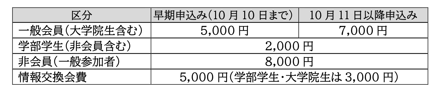 大会参加費および情報交換会費は下表のとおりです。詳細については、下記をご確認ください。